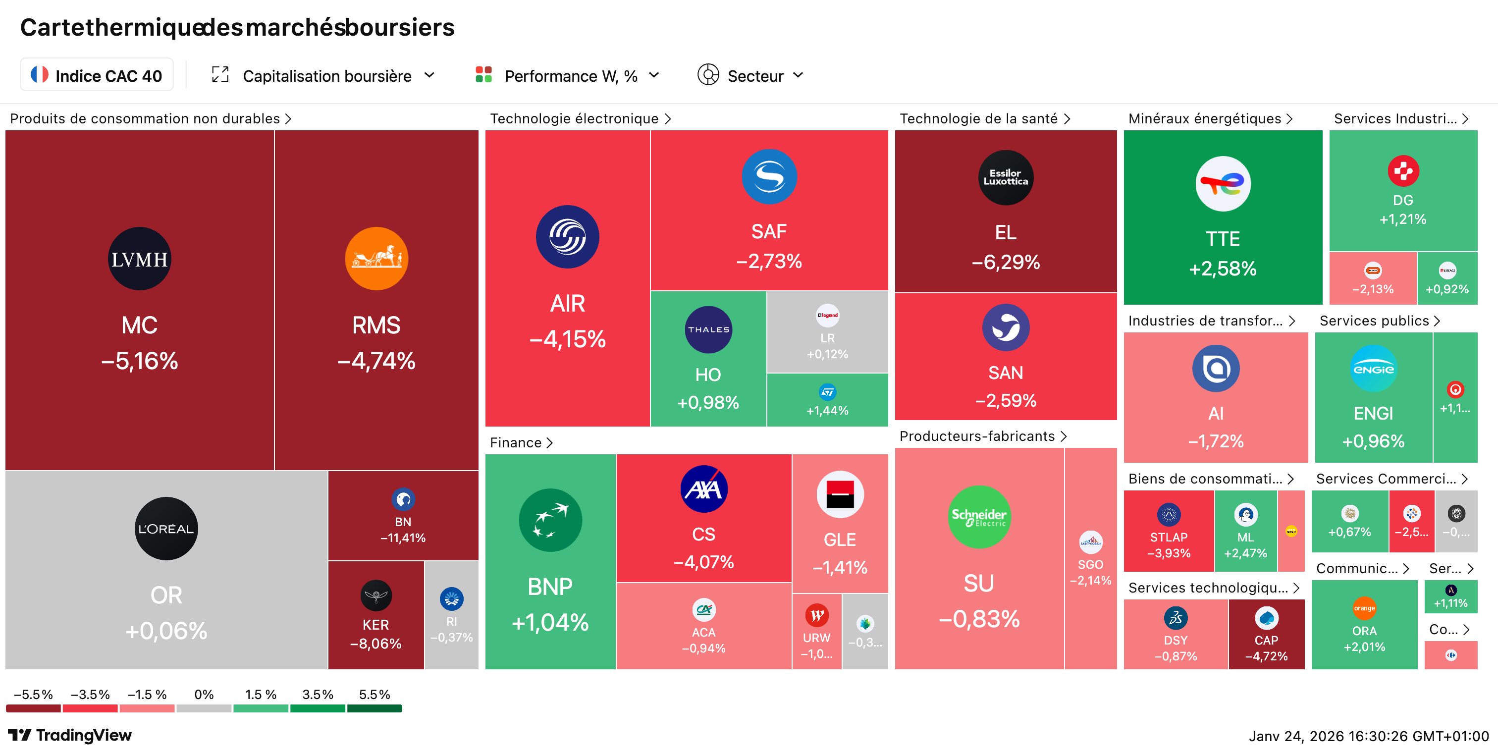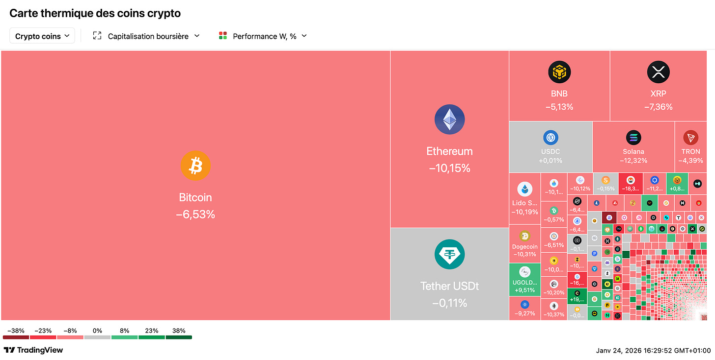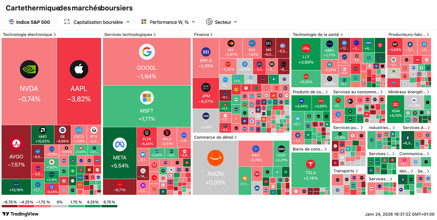📊 Semaine agitée : le CAC 40 cède 1,40 % entre Groenland, 49.3 et earnings mitigés : L’indice parisien termine à 8.143 points, plombé par une semaine géopolitique intense : Trump a finalement renoncé à prendre le Groenland par la force, évoquant un mystérieux “accès total” via l’OTAN. En France, Sébastien Lecornu a survécu à deux motions de censure après un double recours au 49.3 sur le budget 2026 — deux nouvelles motions l’attendent la semaine prochaine. Côté marchés : le Brent gagne +2,5 % à 65,7 $, l’or explose de +8 % à près de 5.000 $/once, tandis que le bitcoin repasse sous les 90.000 $. À Wall Street, Intel, Abbott et Netflix déçoivent, quand P&G et United Airlines rassurent.