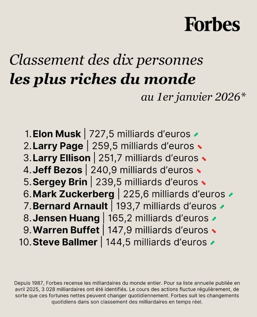 Pour rendre les choses encore plus concrètes : pendant que tu lis cette newsletter (environ 30-35 minutes de lecture), un milliardaire français aura “gagné” l’équivalent d’environ 1,3 fois ton salaire annuel. Et pendant que tu as lu ce seul paragraphe (45 secondes environ), il aura “gagné” près de 1 300 euros.
