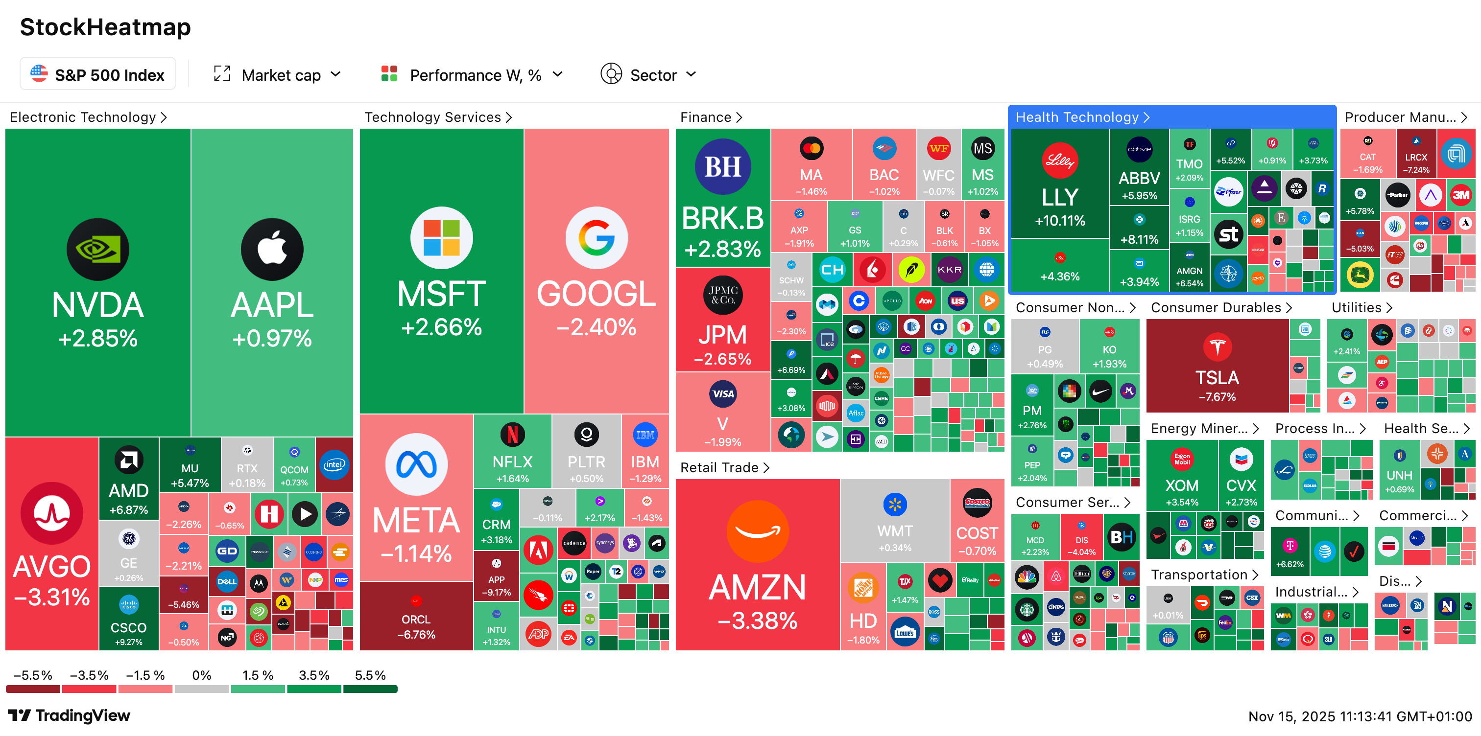 📉 Wall Street décroche : la tech et la Fed ravivent les doutes :Les indices US ont lourdement reculé, pénalisés par les craintes sur les dépenses géantes liées à l’IA et par des messages plus hawkish de la Fed, qui refroidissent les espoirs de nouvelles baisses de taux. Les « Sept Magnifiques » plongent, tandis que le marché obligataire voit les taux remonter. Disney déçoit, Cisco rassure… et Wall Street retombe dans une humeur clairement risk-off.