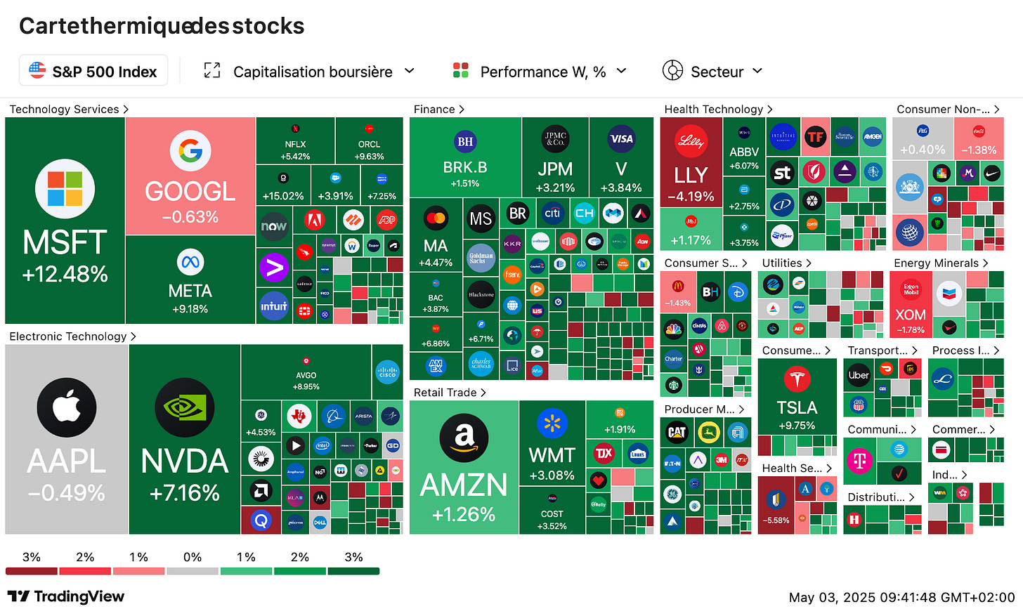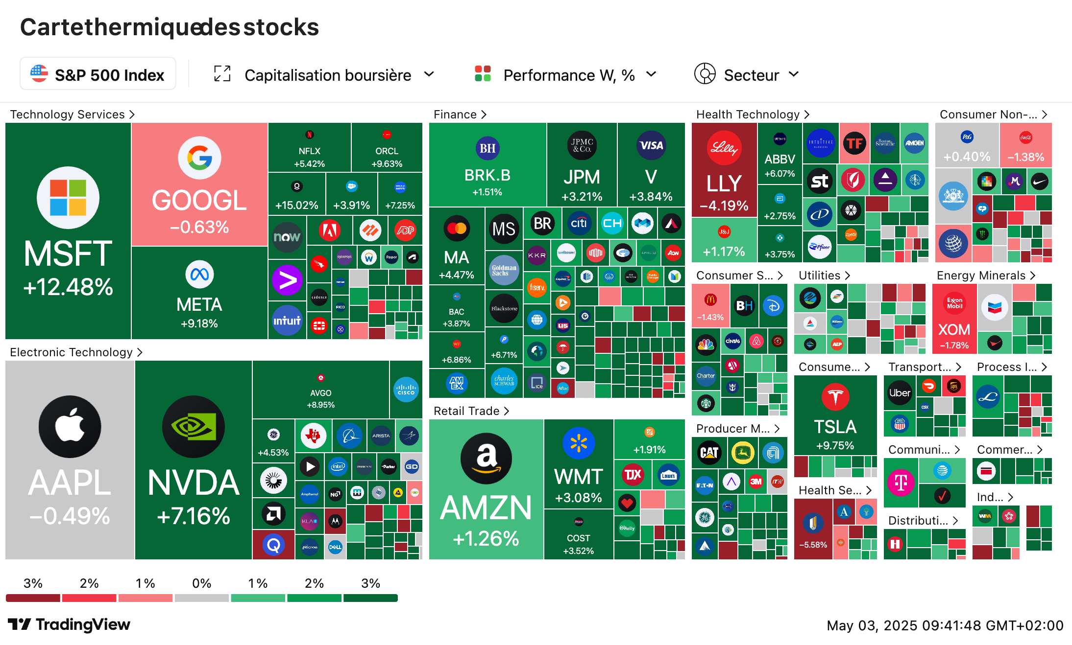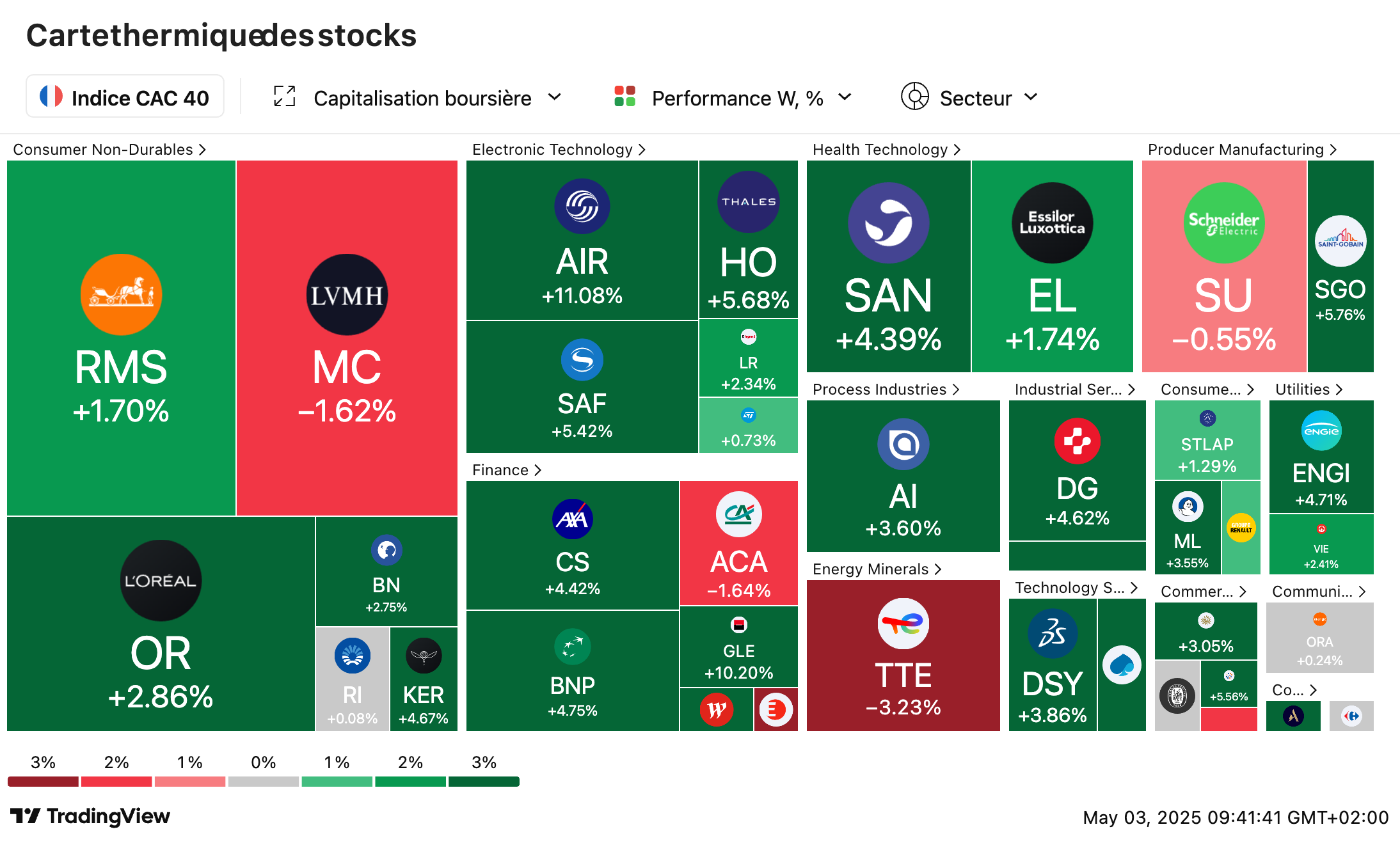 📈🇫🇷 Le Cac 40 rebondit fort : +2,3 %, 3e semaine de hausse : Grâce à une accalmie sur le front commercial et des chiffres de l’emploi US rassurants, la Bourse de Paris a signé l’une de ses meilleures séances de l’année, à 7.770 points. L’économie américaine crée 177.000 emplois, et Airbus flambe de +5 % après des résultats solides. La désescalade tarifaire entre les États-Unis et la Chine ouvre la voie à des négociations commerciales. Côté européen, les PMI d’avril montrent une lueur d’espoir dans l’industrie, malgré un secteur toujours en contraction.