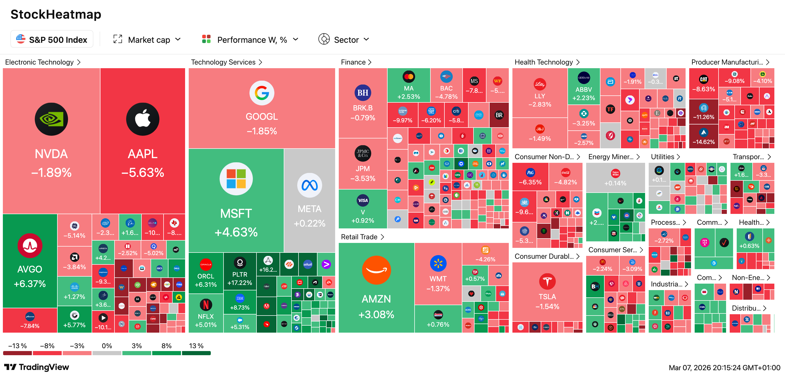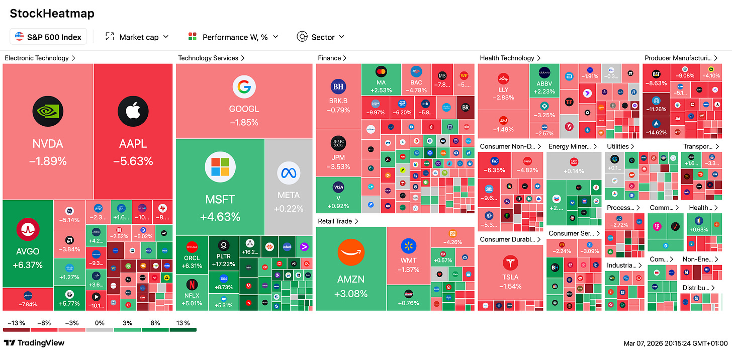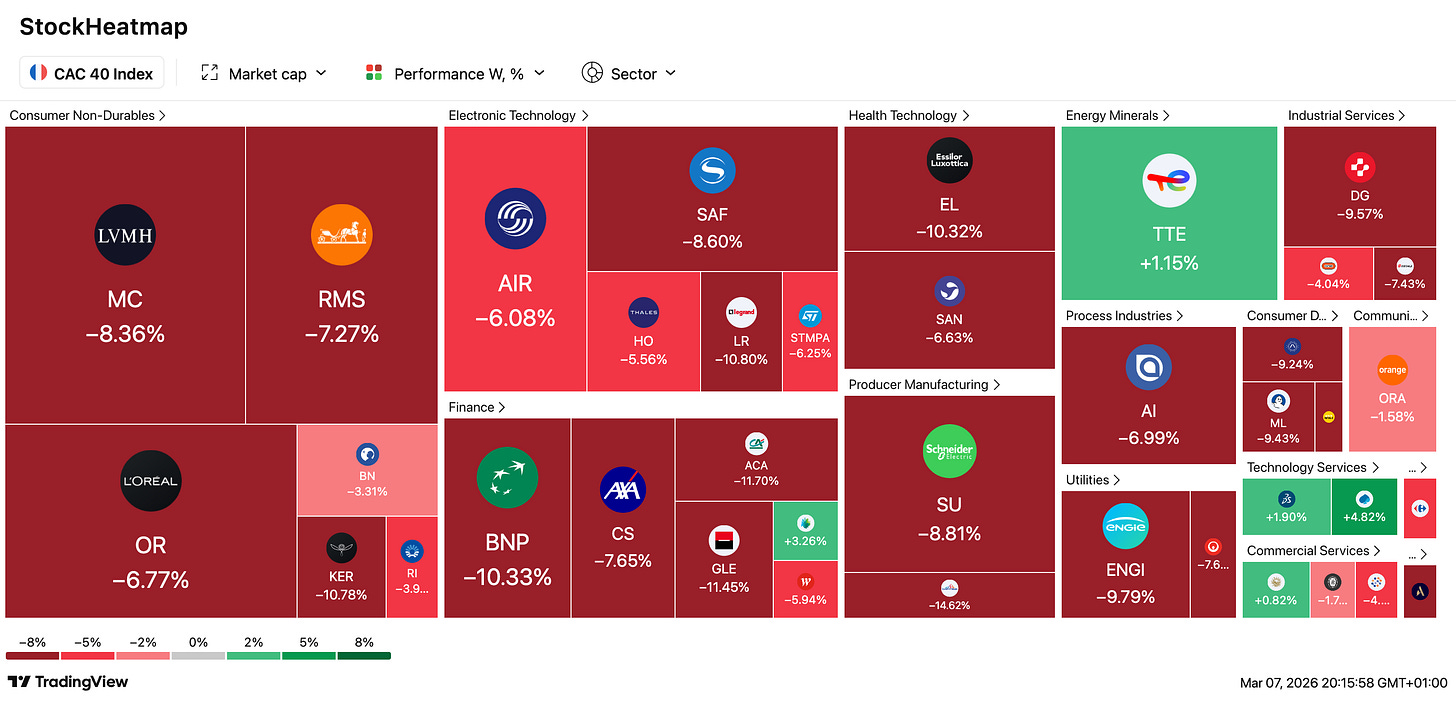 📉 CAC 40 : l’indice cède 1,49 % à 8.045 points, la guerre au Moyen-Orient s’enlise : L’indice parisien efface son rebond matinal alors que Trump affirme que les États-Unis sont proches du “contrôle total” de l’espace aérien iranien — mais Téhéran promet d’intensifier les représailles. Stellantis chute de -3,2 % (pas encore engagé dans le pool carbone Tesla), Soitec -3 %. À l’inverse, STMicroelectronics +3 % (nouveau microcontrôleur), Capgemini +2,4 % (partenariat McDonald’s prolongé). TotalEnergies a vendu 1 million de barils d’Oman à Exxon avec une prime de 7 $/baril, plus haut depuis août 2022.