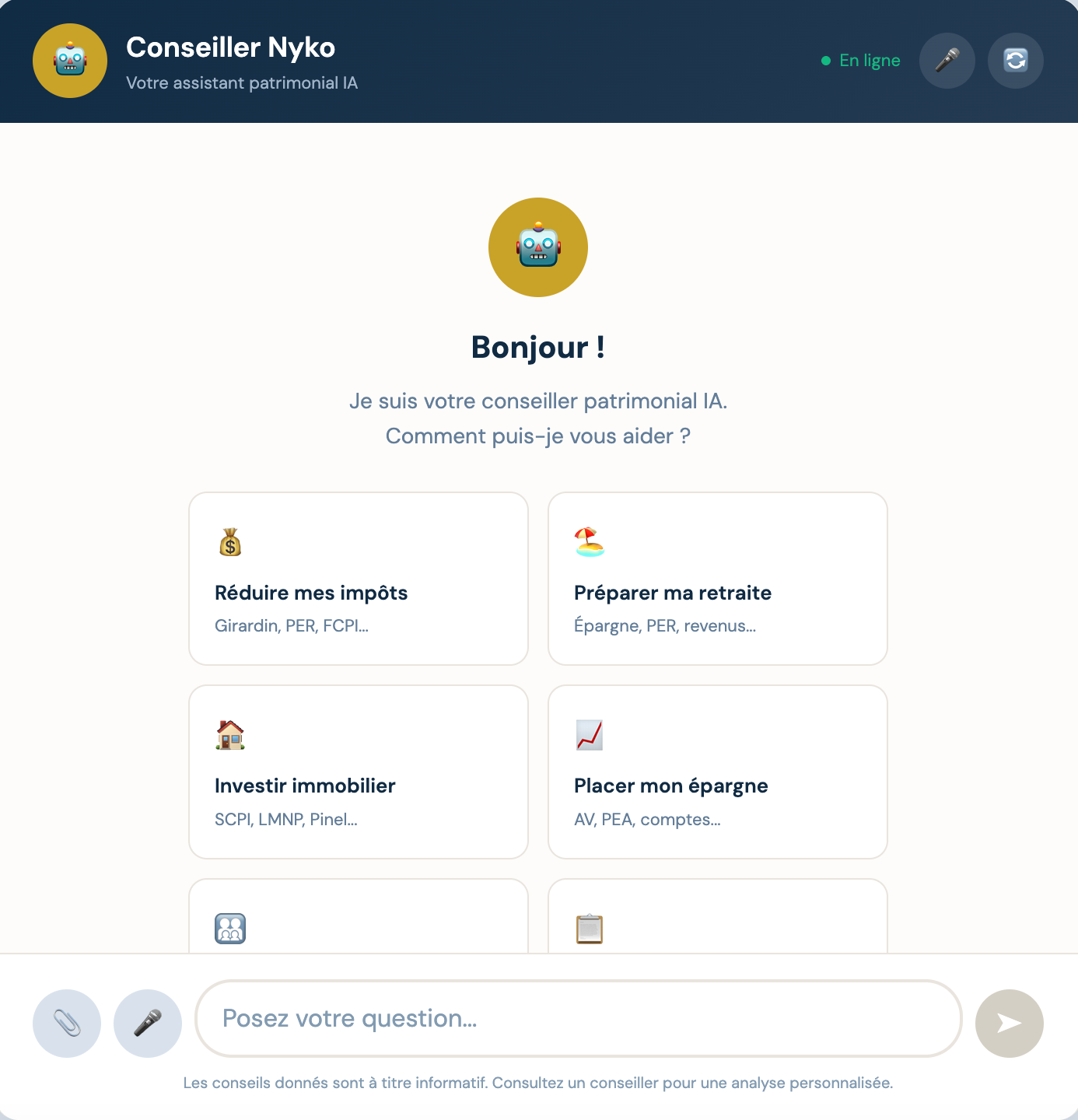 Le ton du chatbot a Ă©tĂ© soigneusement calibrĂ©. Il doit ĂȘtre professionnel mais accessible, prĂ©cis mais pĂ©dagogue. Il utilise des exemples chiffrĂ©s quand câest pertinent pour illustrer un concept abstrait. Il cite les dispositifs fiscaux avec leurs noms exacts pour que le client puisse faire ses propres recherches. Mais surtout, il a des garde-fous stricts : il ne donne jamais de conseil personnalisĂ© sans analyse complĂšte de la situation, et il propose systĂ©matiquement de mettre en relation avec un conseiller humain pour les questions complexes ou les dĂ©cisions importantes.