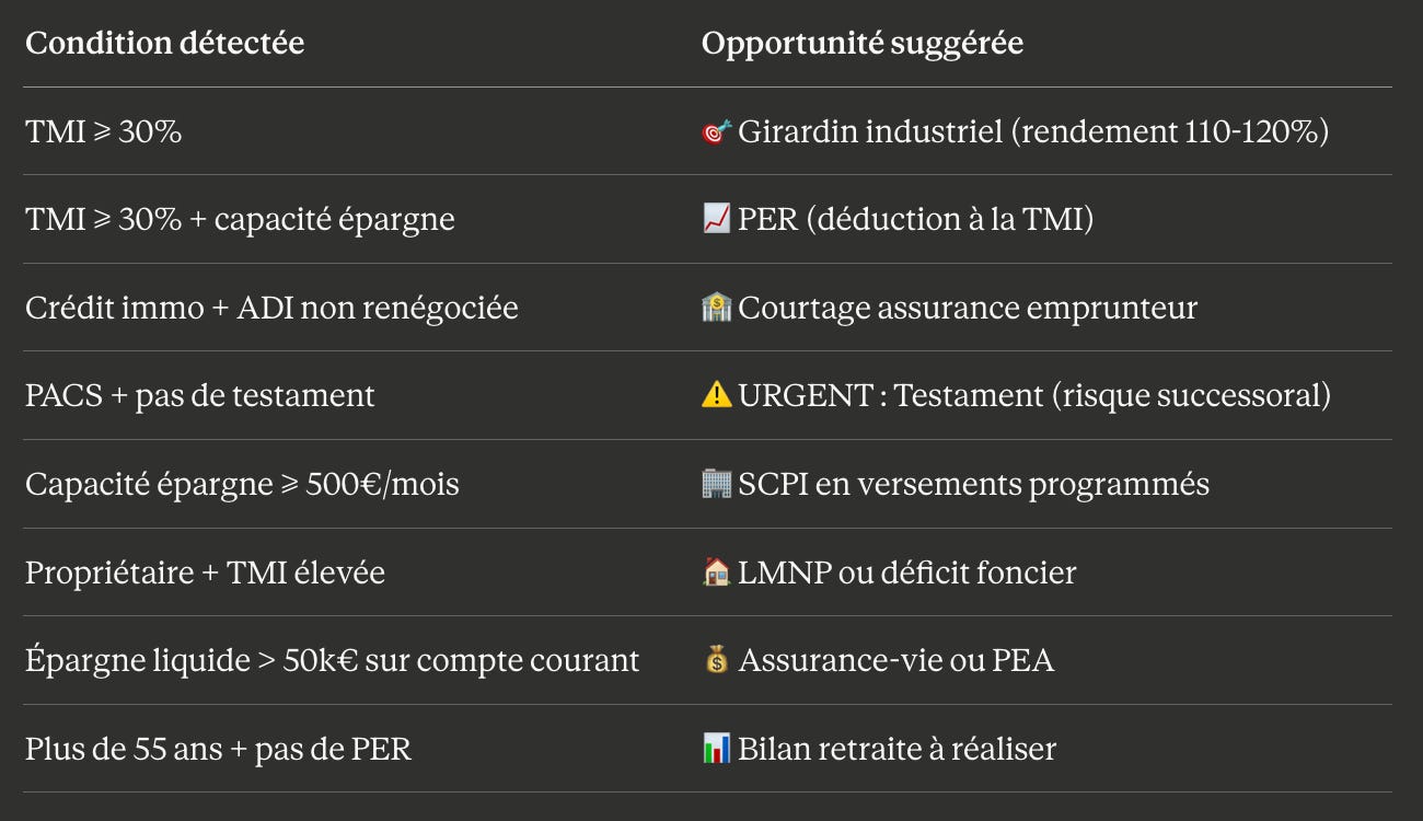 Le systĂšme va plus loin que la simple extraction dâinformations. Il intĂšgre un moteur de dĂ©tection dâopportunitĂ©s basĂ© sur des rĂšgles mĂ©tier que jâai codifiĂ©es Ă partir de mon expĂ©rience de conseiller. Quand le profil du client se prĂ©cise, des suggestions apparaissent dans un panneau latĂ©ral. Le moteur analyse en permanence les donnĂ©es collectĂ©es et les croise avec une base de rĂšgles. Voici quelques exemples concrets des rĂšgles implĂ©mentĂ©es :