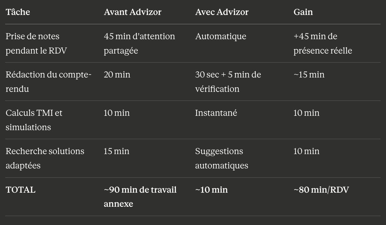 Advizor mâa permis de rĂ©cupĂ©rer du temps prĂ©cieux que je passais sur des tĂąches administratives. Ce temps, je lâinvestis maintenant dans ce qui compte vraiment : la relation avec mes clients, le conseil personnalisĂ©, la crĂ©ation de contenu comme cette newsletter, lâexploration de nouveaux projets. Je suis devenu un meilleur conseiller non pas en travaillant plus, mais en travaillant mieux. LâIA nâa pas remplacĂ© mon mĂ©tier, elle lâa transformĂ© en le recentrant sur sa vraie valeur ajoutĂ©e.