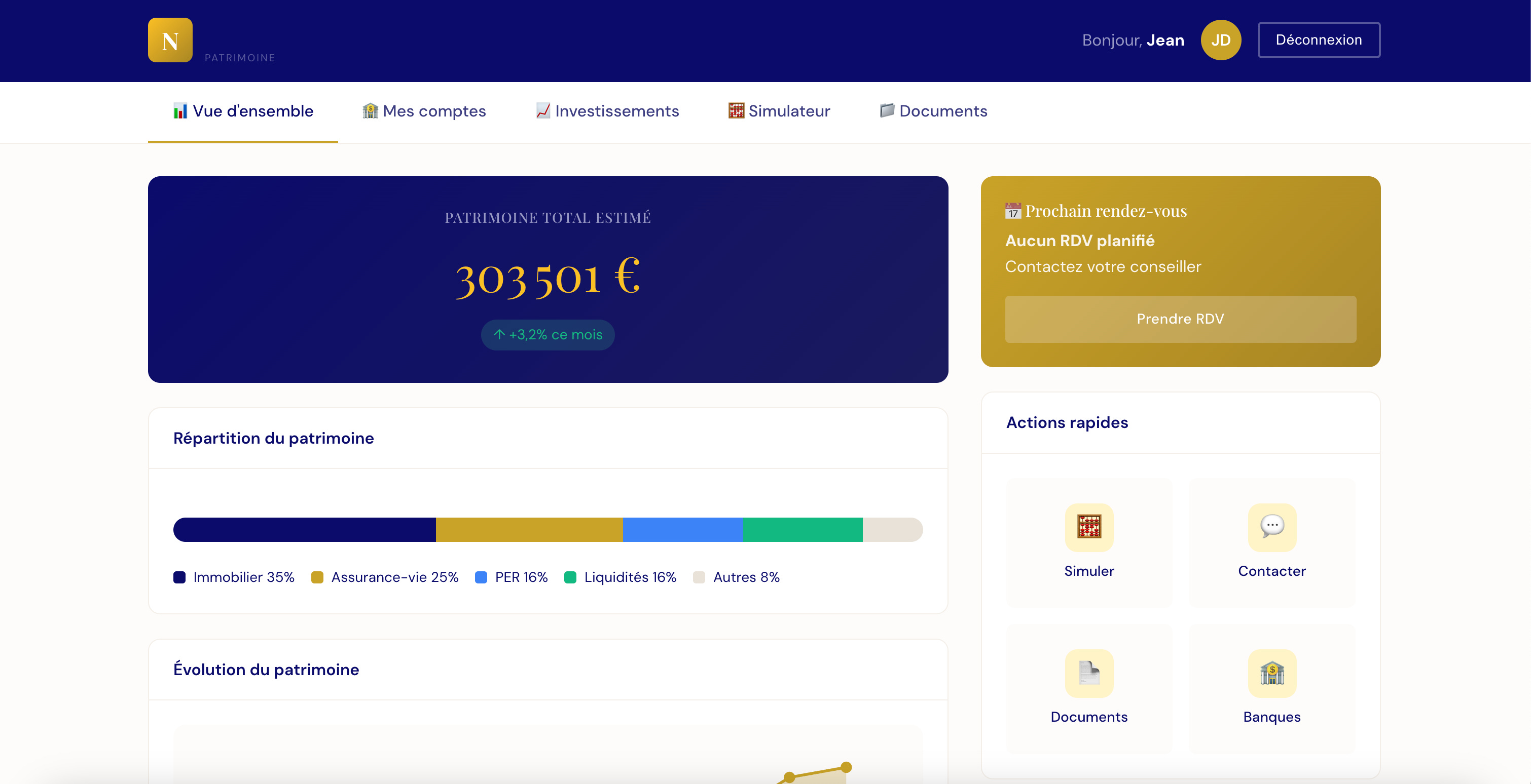 Le deuxiĂšme espace est lâespace client, accessible aprĂšs inscription. Câest le tableau de bord personnel oĂč chaque client peut suivre sa situation patrimoniale. Il y trouve une vue synthĂ©tique de ses placements (contrats, performances, rĂ©partition), tous ses documents centralisĂ©s (lettres de mission, bilans, relevĂ©s), et une messagerie sĂ©curisĂ©e pour communiquer avec moi. Mais surtout, il a accĂšs Ă un chatbot IA disponible 24h/24 qui peut rĂ©pondre Ă ses questions sur la fiscalitĂ©, les placements, les dispositifs de dĂ©fiscalisation... Le client nâa plus besoin dâattendre ma disponibilitĂ© pour obtenir une rĂ©ponse Ă une question simple.