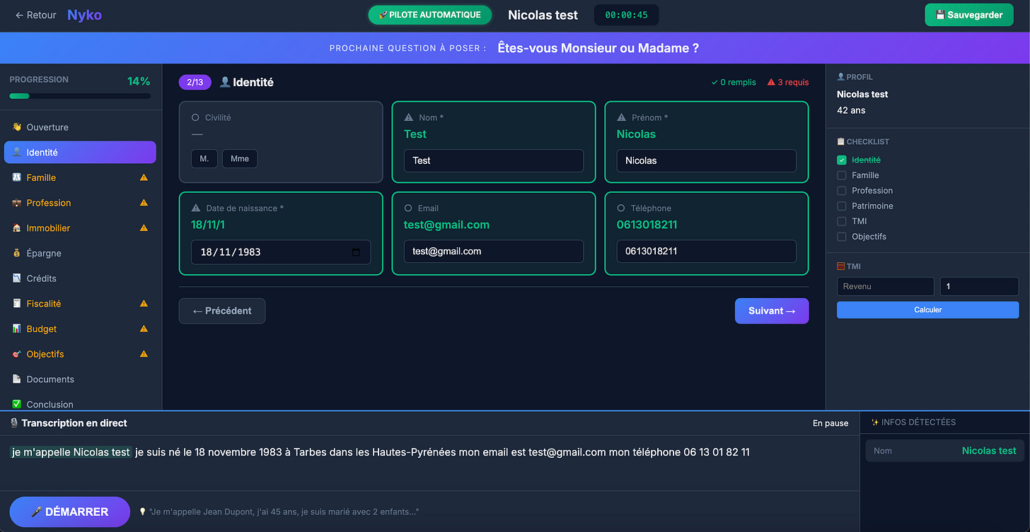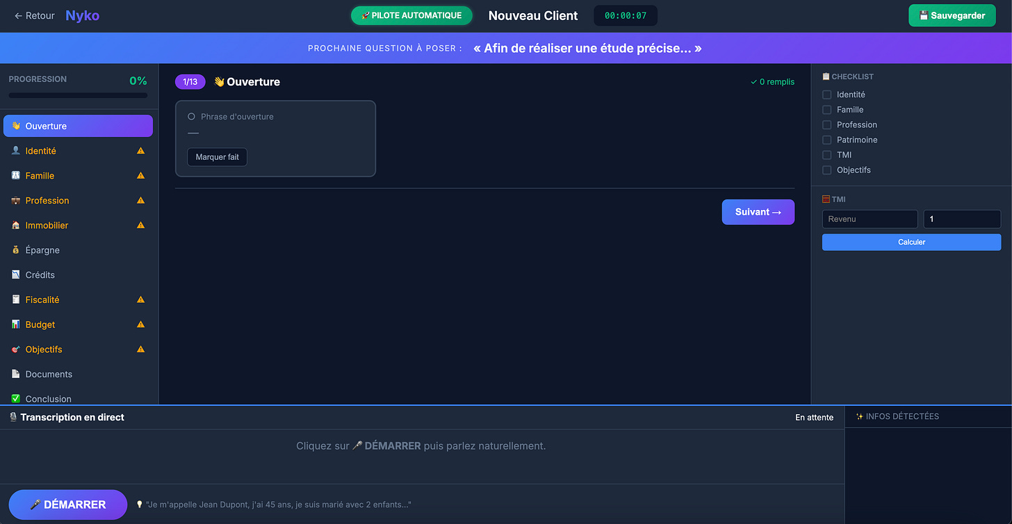 Ă court terme (1-3 mois), je prĂ©vois dâintĂ©grer une connexion bancaire via des services comme Powens ou Budget Insight. LâidĂ©e est de pouvoir rĂ©cupĂ©rer automatiquement les informations patrimoniales du client (comptes, Ă©pargne, crĂ©dits) au lieu de les lui demander oralement. Ăa permettrait des rendez-vous encore plus fluides et des analyses plus prĂ©cises. Je travaille aussi sur la gĂ©nĂ©ration automatique de documents : lettres de mission, rapports de prĂ©conisation, DER (Document dâEntrĂ©e en Relation)... Tout ce qui peut ĂȘtre automatisĂ© doit lâĂȘtre.