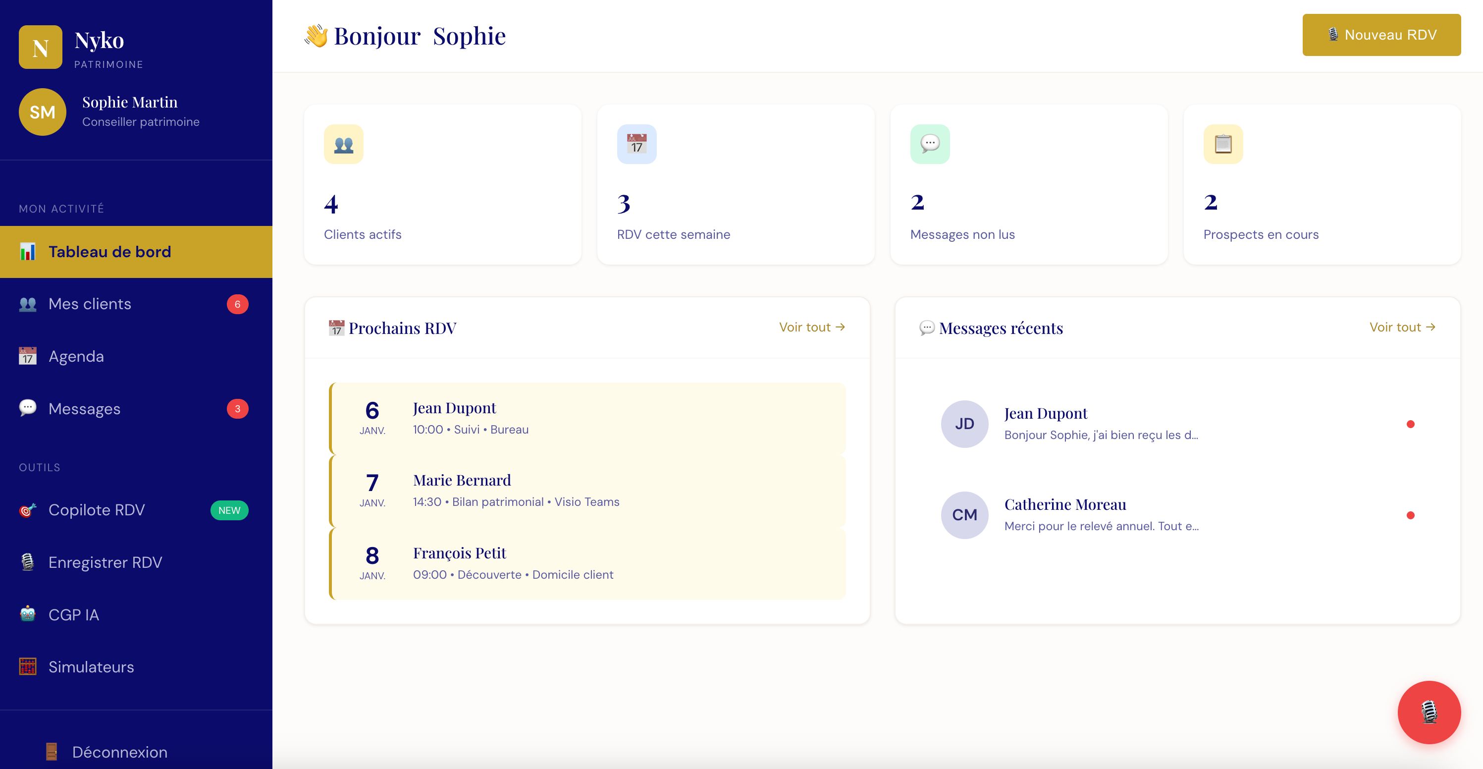 Le troisiĂšme espace est lâespace conseiller, le cĆur opĂ©rationnel de la plateforme. Câest lĂ que la magie de lâIA opĂšre vraiment. Jây trouve la liste de mes clients et prospects, leurs fiches dĂ©taillĂ©es, lâhistorique de nos Ă©changes. Mais lâoutil phare de cet espace, câest le copilote de rendez-vous. Quand je lance une session de rendez-vous, le systĂšme se met Ă transcrire la conversation en temps rĂ©el, Ă en extraire automatiquement les informations clĂ©s, et Ă me suggĂ©rer des opportunitĂ©s en fonction du profil qui se dessine. Ă la fin du rendez-vous, je gĂ©nĂšre un compte-rendu complet en un clic. Je dĂ©taillerai ce copilote plus loin car câest vraiment lĂ que lâIA montre toute sa puissance.