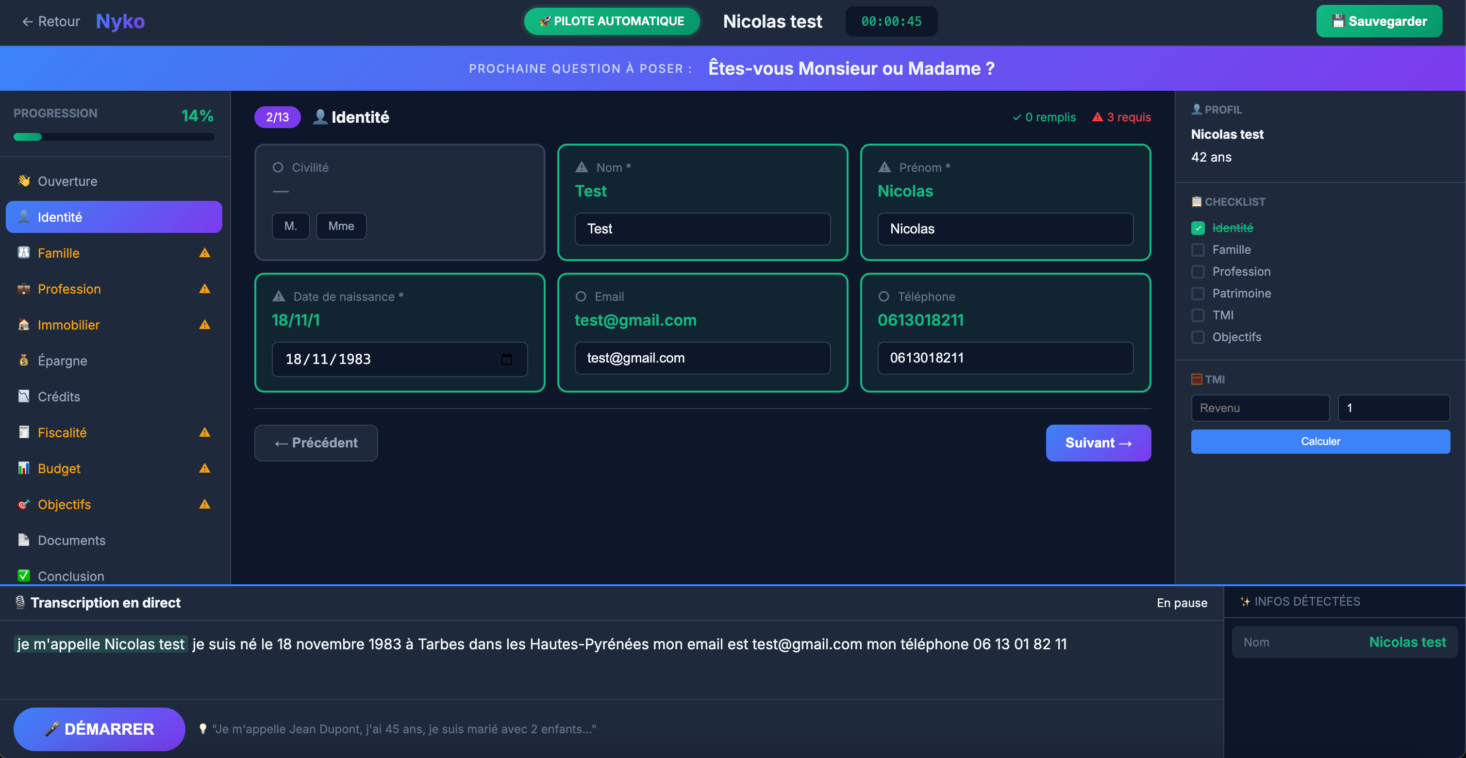 La motivation initiale Ă©tait trĂšs pragmatique : je passais un temps fou sur des tĂąches rĂ©pĂ©titives qui ne nĂ©cessitaient pas mon expertise de CGP. Chaque rendez-vous dĂ©couverte impliquait de poser les mĂȘmes questions, de prendre des notes manuscrites, de les retranscrire ensuite dans mes outils, de rĂ©diger un compte-rendu, de calculer manuellement les tranches dâimposition, dâidentifier les solutions adaptĂ©es... Autant de tĂąches mĂ©caniques qui grignotaient mon temps et mon Ă©nergie, alors que ma vraie valeur ajoutĂ©e rĂ©sidait dans la relation client et le conseil personnalisĂ©.