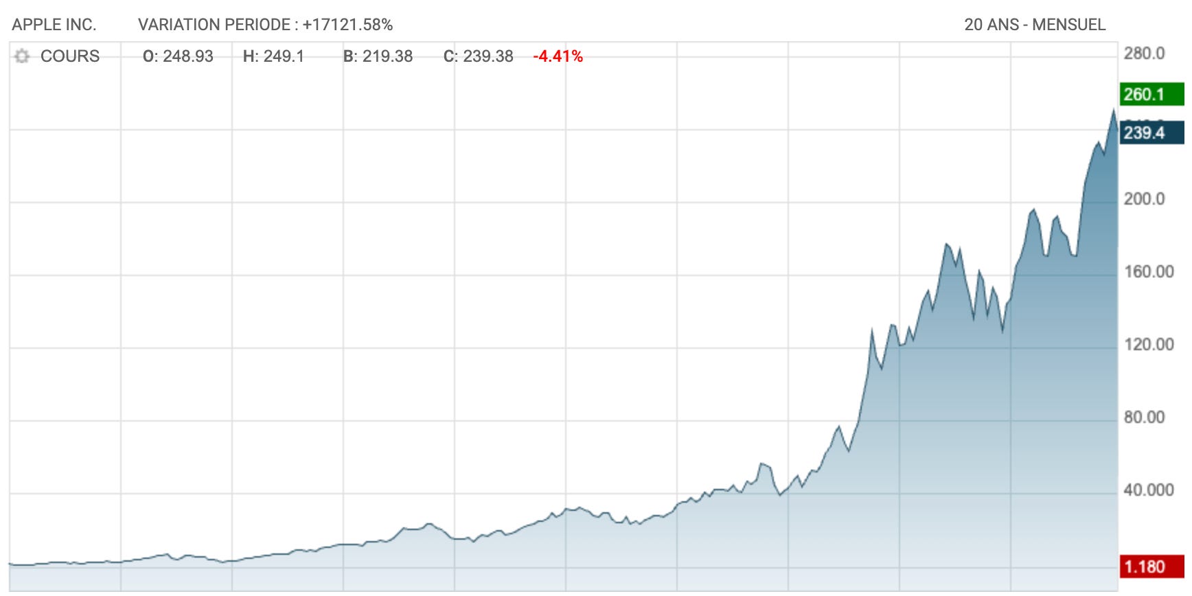 En achetant Apple à moins de 1 $ avec une marge de sécurité énorme, ces investisseurs ont sécurisé leur capital et misé sur une croissance exponentielle. Résultat ? Aujourd’hui, l’action Apple vaut plus de 230 $, soit une multiplication par plus de 230 en 20 ans.