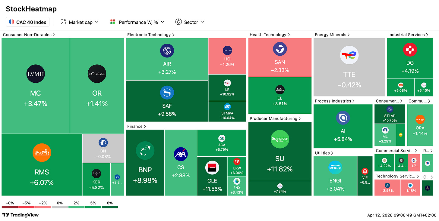 📊 CAC 40 stable à 8 256 pts, mais Sodexo s’effondre de -18,6 % après un avertissement : Le groupe de restauration collective Sodexo plonge lourdement après avoir abaissé ses objectifs 2026, invoquant une “dynamique commerciale plus faible” et une pression sur les volumes. En toile de fond, l’inflation allemande accélère à 2,8 % en mars (vs 2,0 % en février), tandis que les marchés attendent l’IPC américain et l’indice de confiance du Michigan. Le Brent reflue vers 96,83 $, l’or se maintient à 4 760 $/oz. Côté valeurs, Robertet (+EBITDA de 10,9 %), Soitec (rebond semi-conducteurs après TSMC) et Imerys (acquisition US) progressent.