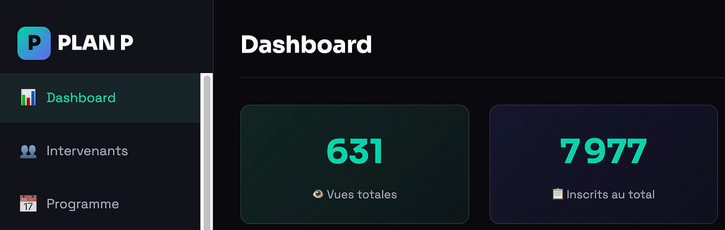 Après la semaine, on ne disparaît pas. On construit un écosystème : newsletter Substack, YouTube Shorts des meilleurs moments, podcast avec les intervenants, lives hebdomadaires “Les Off de Plan P”.