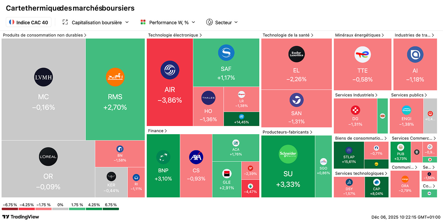 🚀 SpaceX tutoie les sommets avec une valorisation ciblée à 800 milliards $ : La société d’Elon Musk discute avec des investisseurs d’une nouvelle vente d’actions qui porterait sa valorisation à 800 milliards de dollars, soit le double de son niveau actuel. Une telle opération permettrait à SpaceX de redevenir la start-up la plus valorisée au monde, devant OpenAI, portée par le succès de Starlink, sa domination dans les lancements spatiaux commerciaux et la confiance du marché dans l’écosystème Musk.