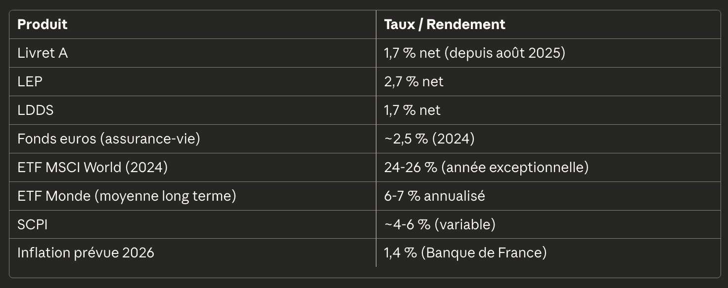 Parce qu’en 2026, les cartes ont changé. Le taux du Livret A est tombé à 1,7 % depuis le 1er août 2025 — contre 2,4 % auparavant. L’inflation se stabilise autour de 0,9 à 1,4 % selon les projections de la Banque de France. Et les marchés financiers n’ont jamais été aussi accessibles : en 2024, le nombre d’investisseurs en ETF en France a bondi de 70 % pour atteindre 509 000 personnes.