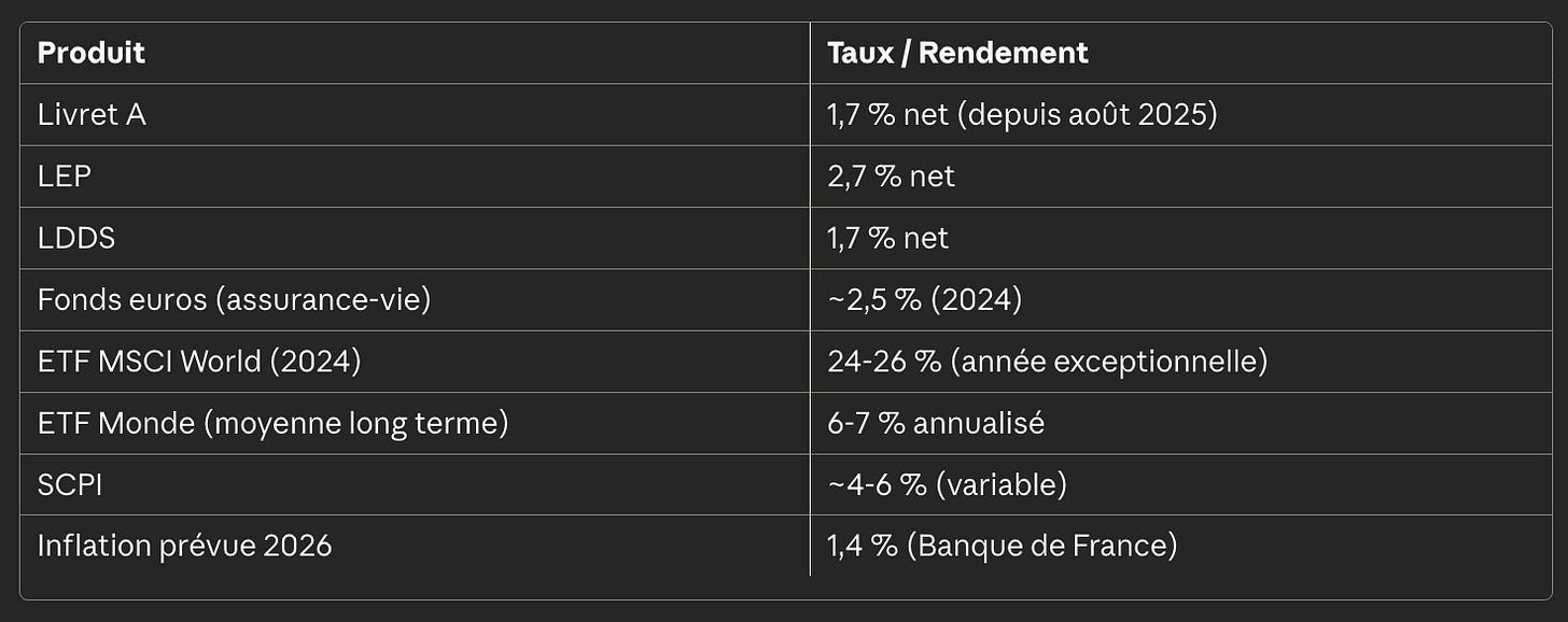 Dans ce contexte, un Livret A à 1,7 % offre un rendement réel légèrement positif — entre 0,3 et 0,7 % selon les années. Mieux que rien. Mais très loin de ce qu’il faut pour construire un patrimoine.